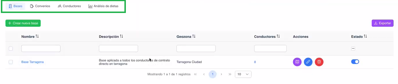 Aquí defines las bases de tus conductores. Funcionan como punto de referencia para determinar si un conductor está “en base” o “fuera de base” al calcular dietas. - Convenios