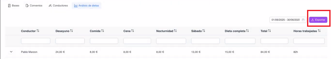 Muestra todos los conductores que tienen un convenio de dietas asignado. El historial de dietas se conserva siempre, incluso si el conductor deja de estar en la plataforma. - Análisis de dietas
