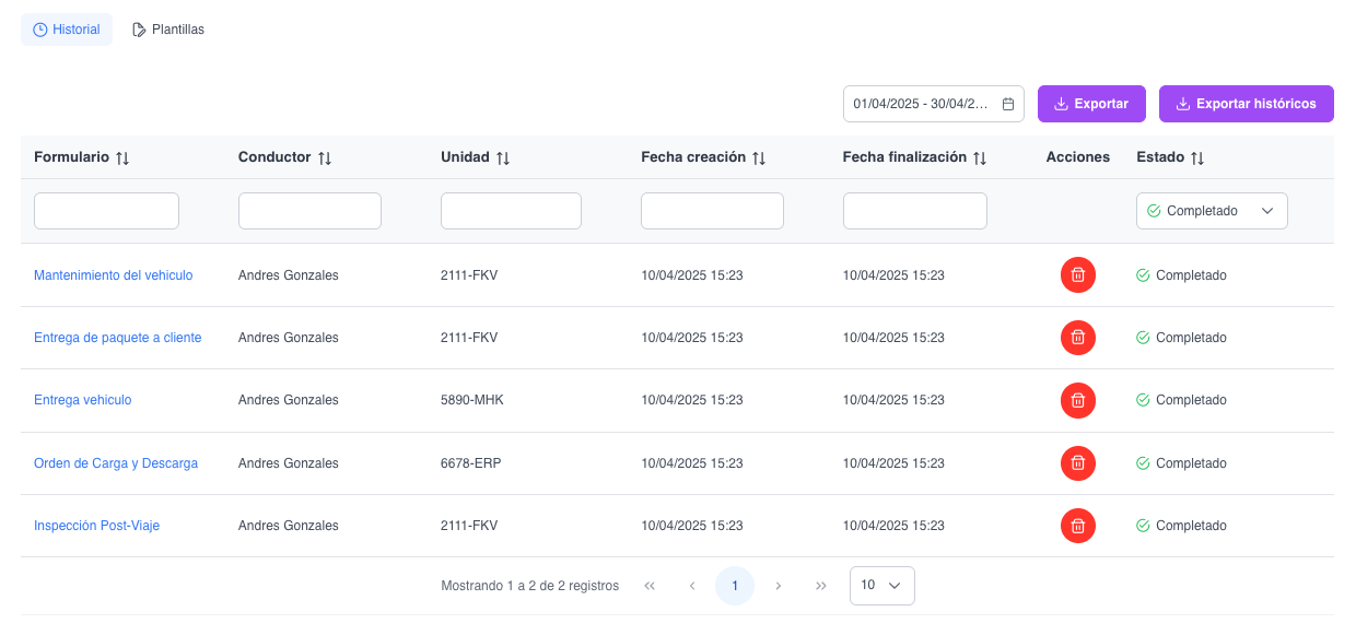 Sin embargo, para acceder a los registros creados antes del 25/04/2025, deberás utilizar el nuevo botón “Exportar históricos”. Desde allí podrás consultar y exportar todos los formularios anteriores al cambio, conservando el formato y la visualización habitual.