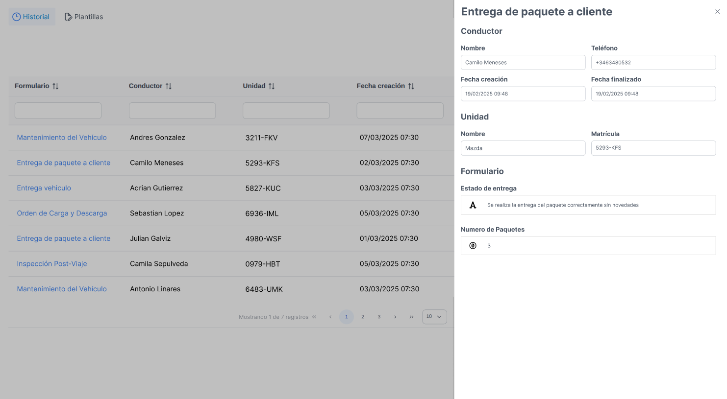A medida que los conductores completan los formularios, estos se registran en el sistema y quedan accesibles desde la plataforma. Puedes consultar todos los formularios recientes o anteriores, verificar qué formularios están completados y cuáles aún están pendientes, y analizar posibles motivos si hay tareas sin realizar.
